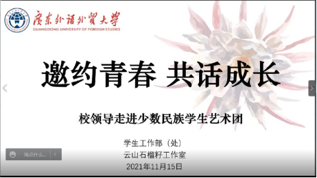 11月15日晚,“邀约青春,共话成长”校领导走进少数民族学生艺术团活动通过腾讯会议线上举行。出席本次活动的领导有刘海春副校长、学生处国佳副处长、学生管理科殷毅山科长。学生管理科范丽颖老师、少数民族专职辅导员热米莱和爱克达老师、少数民族学生艺术团全体成员及2021级少数民族预科班同学参加了此次活动。活动由国佳主持。