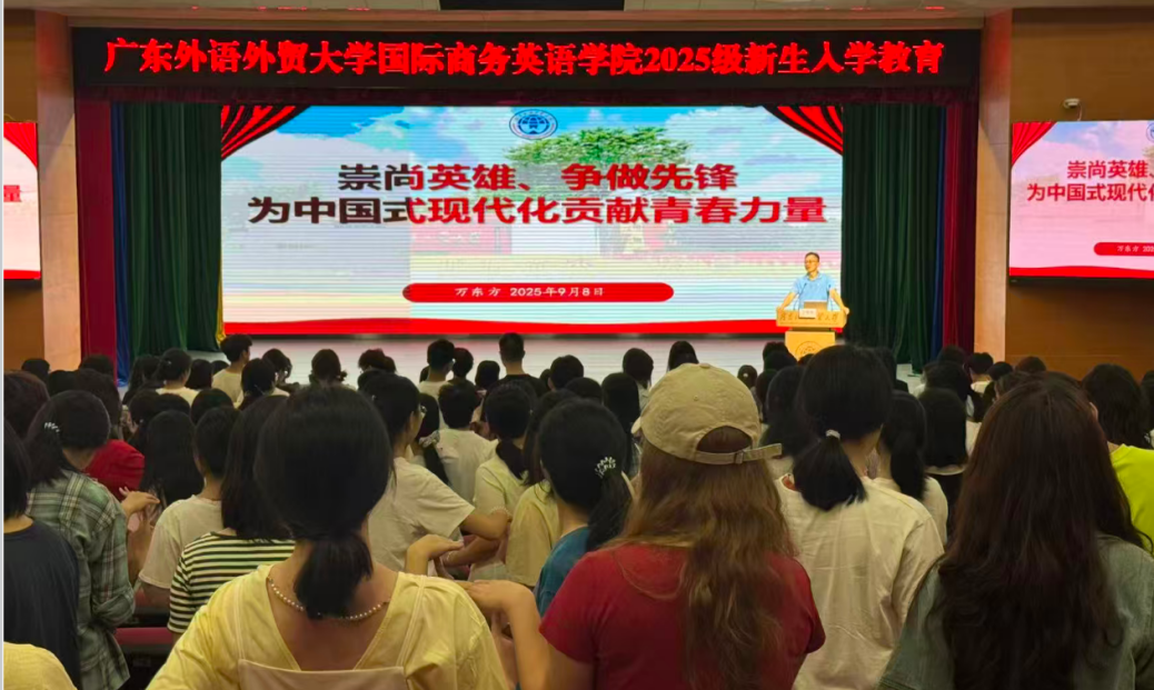 为加强2025级新生爱国主义教育,2025年9月,商英学院与商学院分别邀请工作室主持人万东方老师为2025级新生开展“崇尚英雄、争做先锋,为中国式现代化贡献青春力量”主题讲座。万东方带领全体学生学习了习近平总书记在纪念中国人民抗日战争暨世界反法西斯战争胜利80周年上的讲话,重温了阅兵仪式的高光时刻,系统阐述了习近平总书记关于英雄文化重要论述的主要内容、价值意蕴以及实践路径。万东方以邵书琴、多语言志愿服务队的先进事迹为例,激励全体新生学习榜样、争做先锋,为学校发展与建设贡献青春力量。