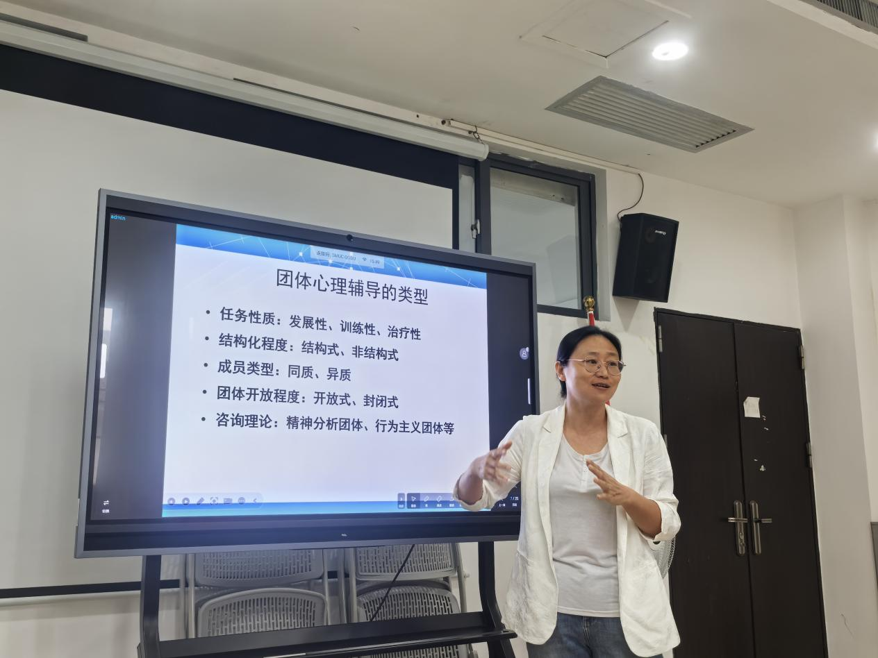 为提升培训针对性,会前,春晖辅导员工作室精心设计问卷,面向全校同学就大学生心理团体辅导的认知和需求展开广泛调研,并根据调研结果初步拟定心理团体辅导方案。培训过程中,阎茹围绕团体心理辅导的基本概念、发展阶段、过程中的危机识别及效果评估等重点环节展开分享,系统阐释了其核心内容与实际成效,强调“在互动中学习、观察、体验”的重要性,并指出掌握该技能对个人能力提升与职业发展的双重价值。随后,她针对不同类型团体心理辅导的适用对象、场景及发展阶段进行详细讲解,重点分析了各阶段常见难题与应对策略,讲解内容生动易懂。
