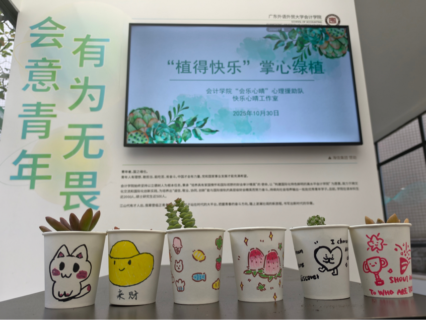 此次“植得快乐”掌心绿植活动,以贴近生活的形式为同学们搭建了一个放松身心、互动交流的平台。40余盆满载心意的手绘多肉盆栽,一张张真挚动人的纸条,既是装点生活的绿色点缀,更是治愈心灵的“小确幸”。未来,快乐心晴工作室也将持续推出更多此类活动,助力同学们在大学时光中涵养健康心灵。