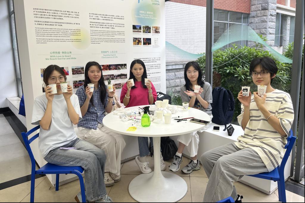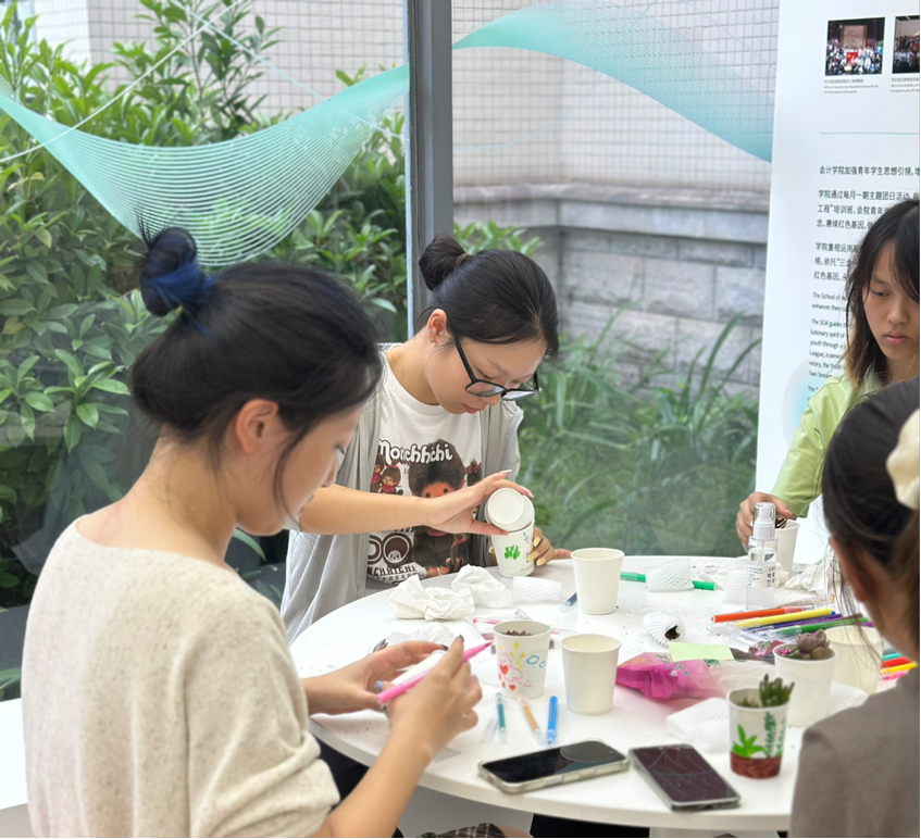随后,同学们拿起画笔开始创意手绘,在专属纸杯上尽情释放灵感——灵动的卡通形象、温暖的治愈文字、简约的几何图案,每一笔都充满个性巧思,让普通纸杯蜕变为独一无二的“绿植小家”。