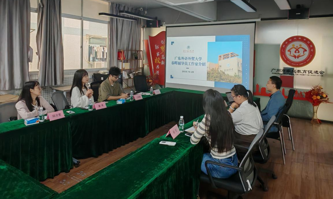 10月29日上午,广东外语外贸大学春晖辅导员工作室一行赴广州市家庭教育促进会(以下简称“家促会”)开展座谈交流。家促会秘书长朱希涛、党支部书记向莎莎、项目经理杨亚,工作室主持人秦雨及成员王文宇、邱月雯、王斯勤参加会议。双方围绕家校社协同推动家庭教育、青少年心理健康及公益实践等议题展开深入研讨,共谋协同育人新路径。