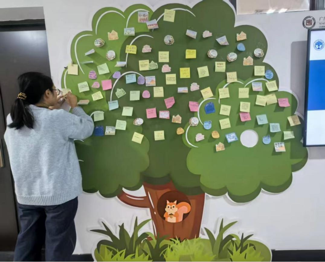 最后,同学们在便利贴上写下自己的心事、烦恼、目标以及对他人的勉励和祝福,并贴到工作室的“心晴树”上,抒发了自己的思绪,传达了美好的祝福。