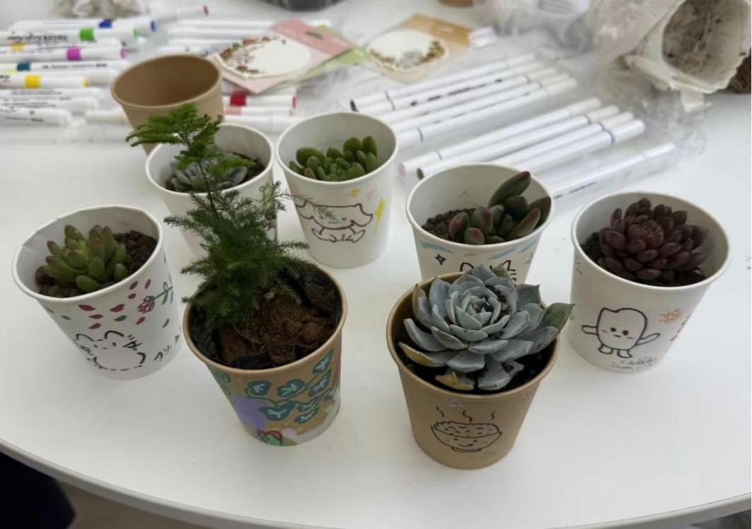 种植完成后,大家纷纷将成品整齐摆放展示,绿意盎然的小植株错落成一方治愈的角落。现场的轻松氛围吸引了许多师生驻足,欣赏这些饱含心意的作品。