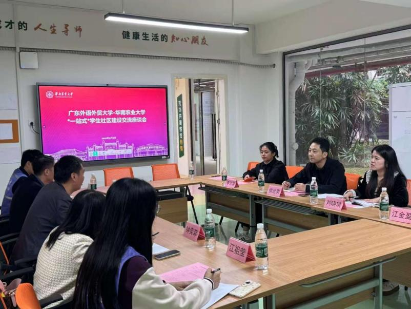 2025年11月4日,我校“邻里力”学生社区辅导员工作室一行赴华南农业大学,就“一站式”学生社区综合管理模式建设开展专题调研。党委学生工作部副部长侯运男、“邻里力”学生社区辅导员工作室主持人刘晓琪及工作室学生骨干代表江金盈、李欣馨参与本次调研。华南农业大学党委学生工作部副部长陈翱,思想政治教育科科长周志荣、主任科员钟奕菲,以及学生社区自我管理委员会总会长李健鸿、启林北分会会长江祖莹参加交流会。